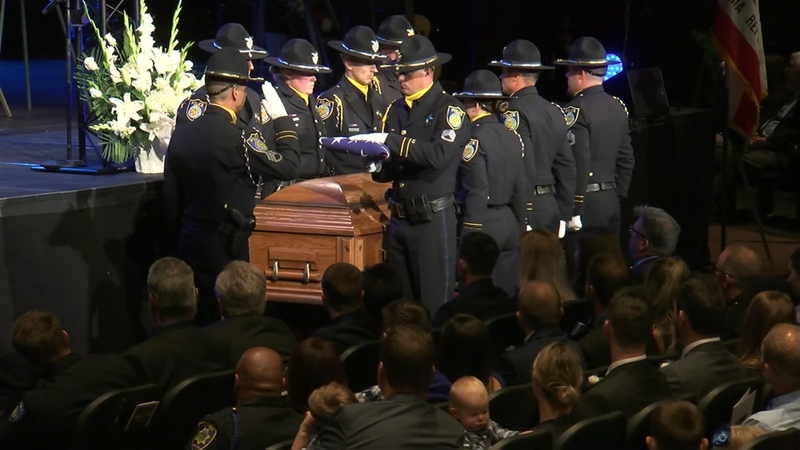 Families gathered along parts of the roughly 30-mile (48-kilometer) funeral procession following the service, waving American flags and pausing to pay their respects to a young officer who may never have patrolled their suburbs and bedroom communities but whose killing still touched them.